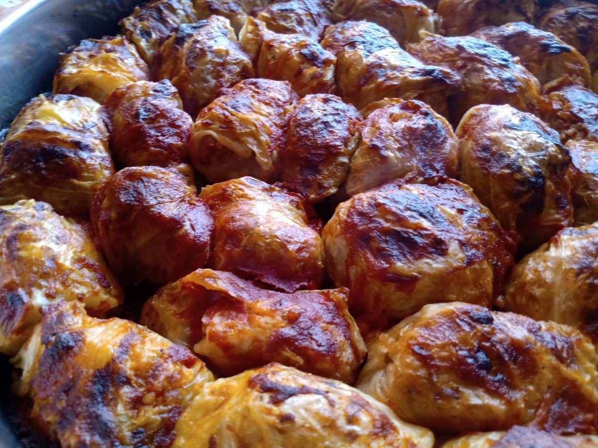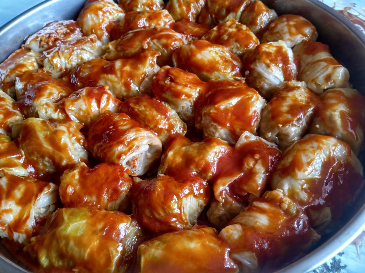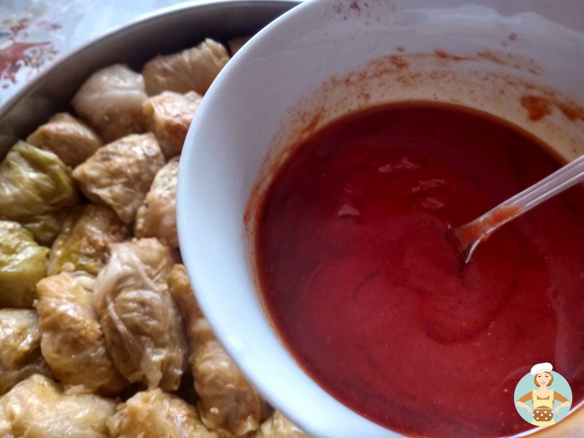 - Сварените сарми нареждам в намазнена с олио тава. Мажа ги със сместта от доматено пюре, олио и червен пипер. Запичат се до готовност във фурна на около 230 градуса.