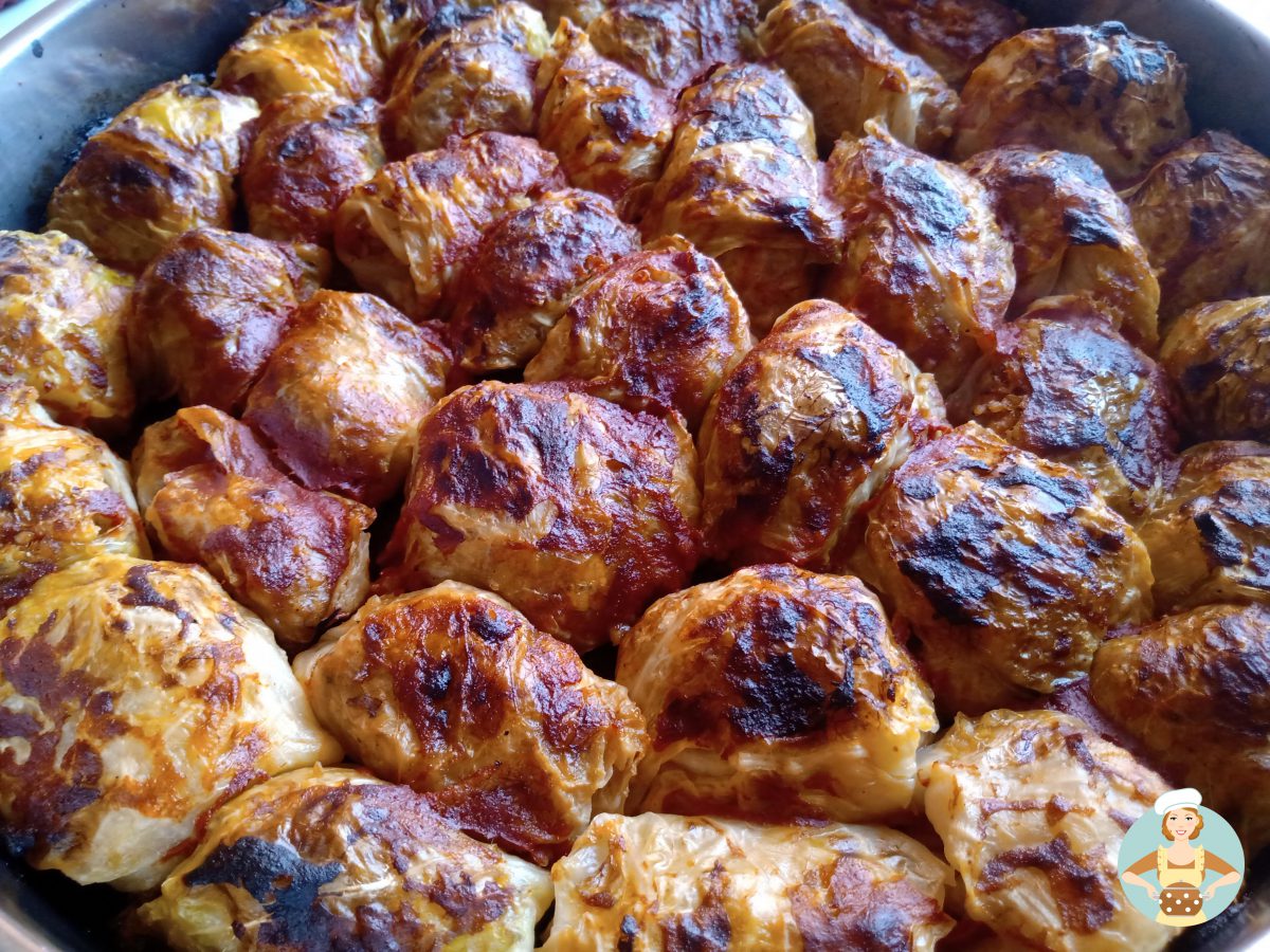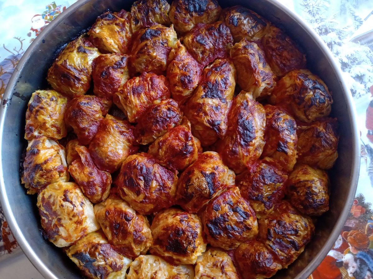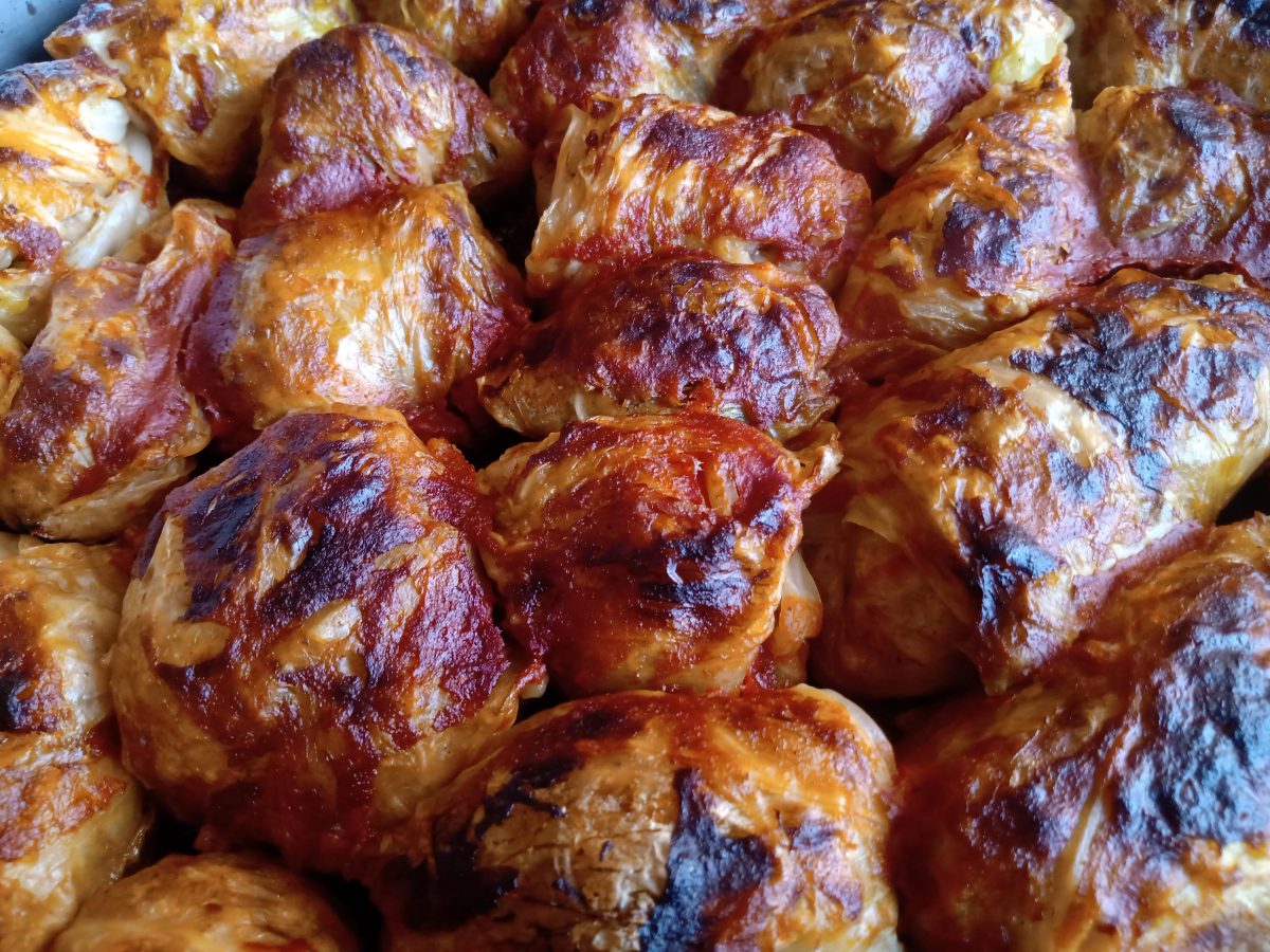 - Сварените сарми нареждам в намазнена с олио тава. Мажа ги със сместта от доматено пюре, олио и червен пипер. Запичат се до готовност във фурна на около 230 градуса.