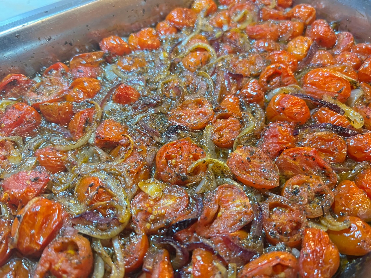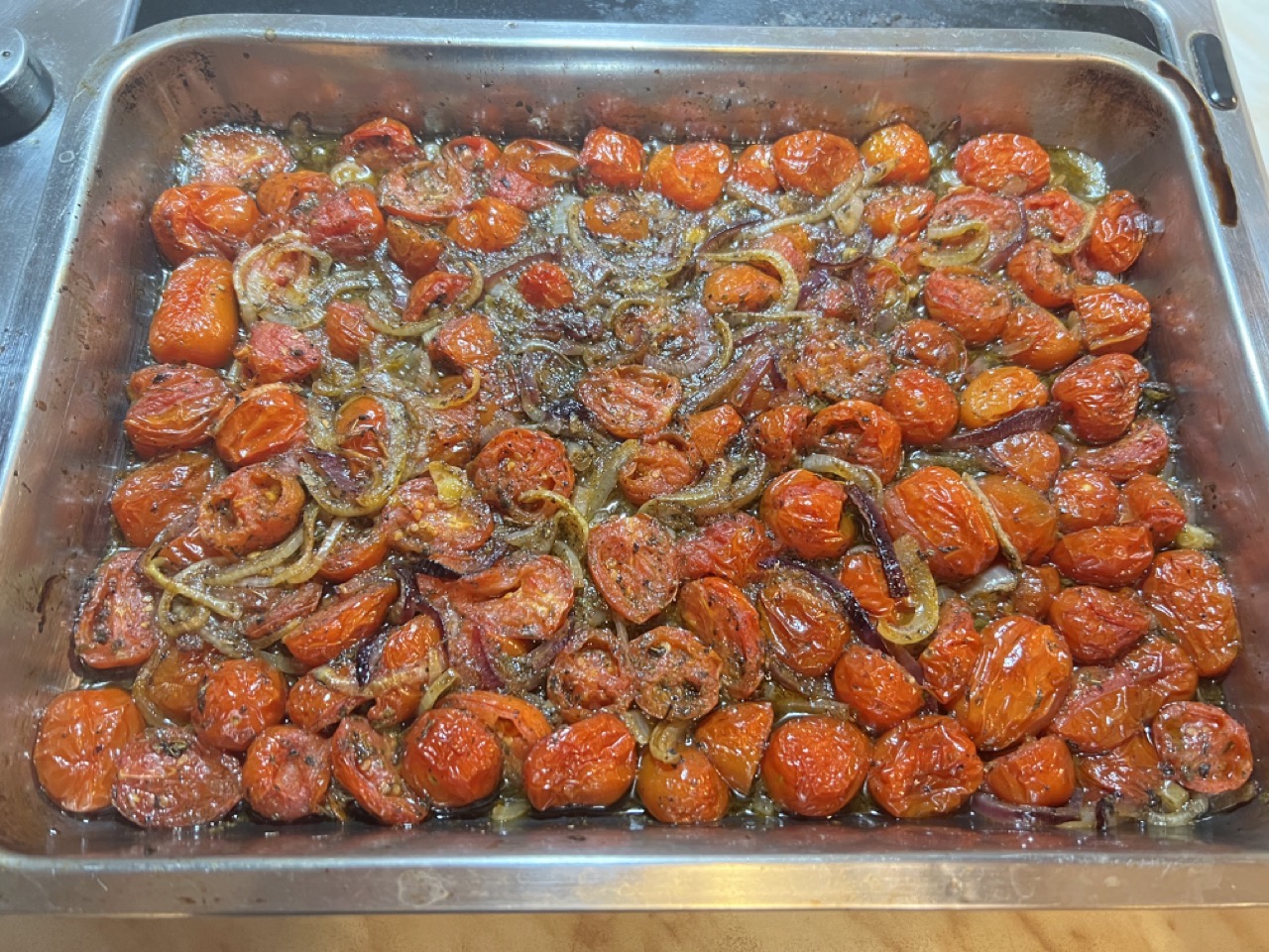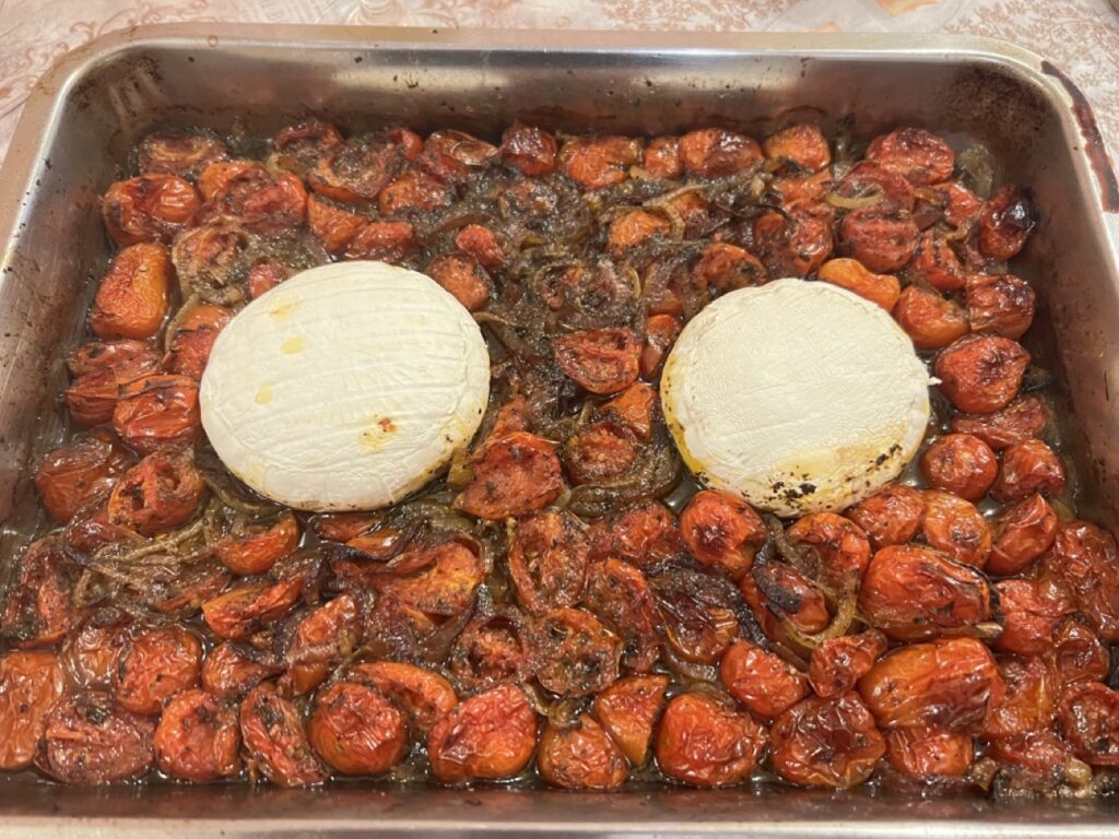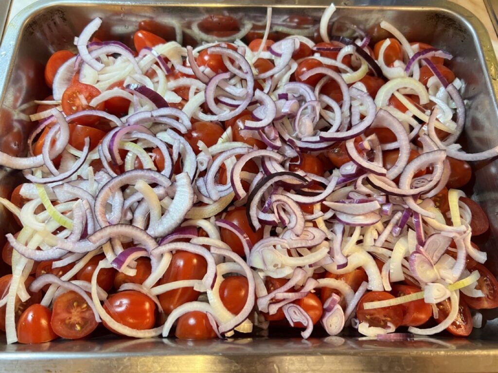 В галерията по-долу ще видите двойна доза на предястието. За него ползвах около 900 грама чери домати и два броя камамбер от по 125 грама. Останалите съставки са същите като в рецептата по-горе. За да е разнообразно и цветно, ползвам бял и червен лук.