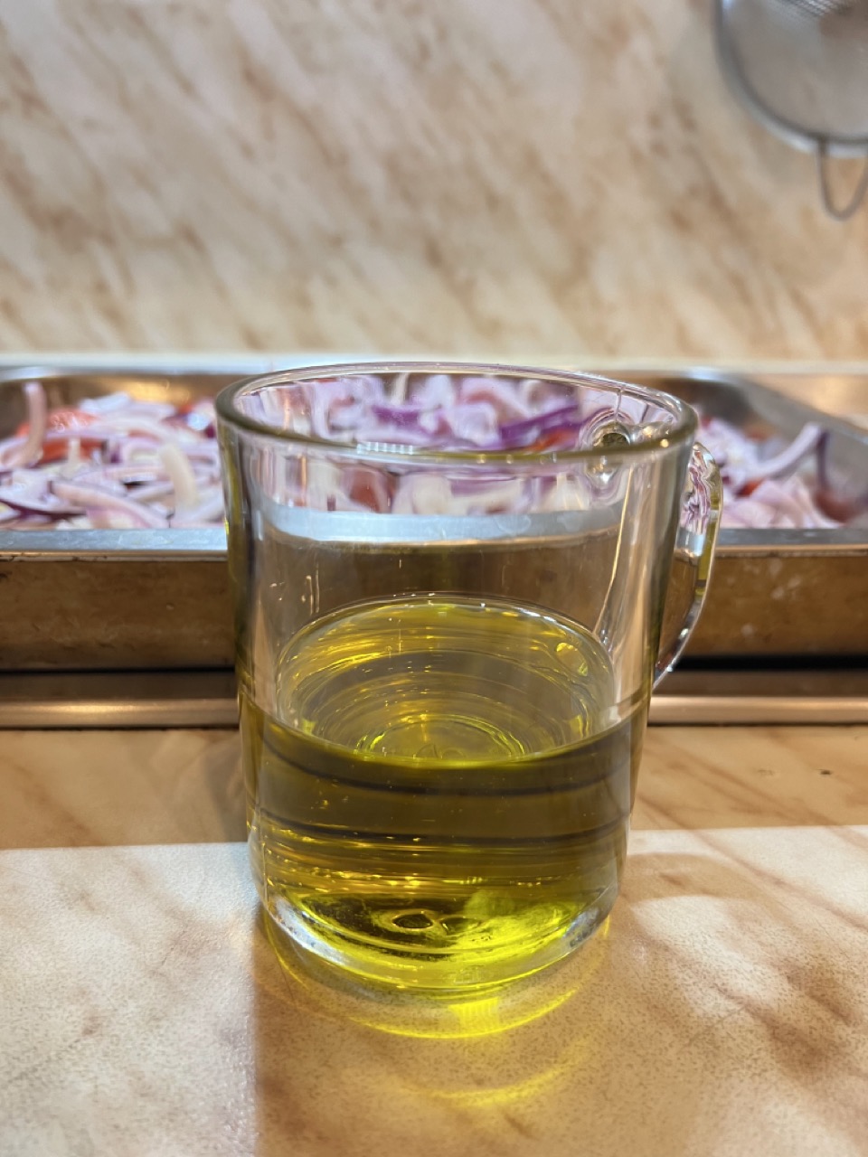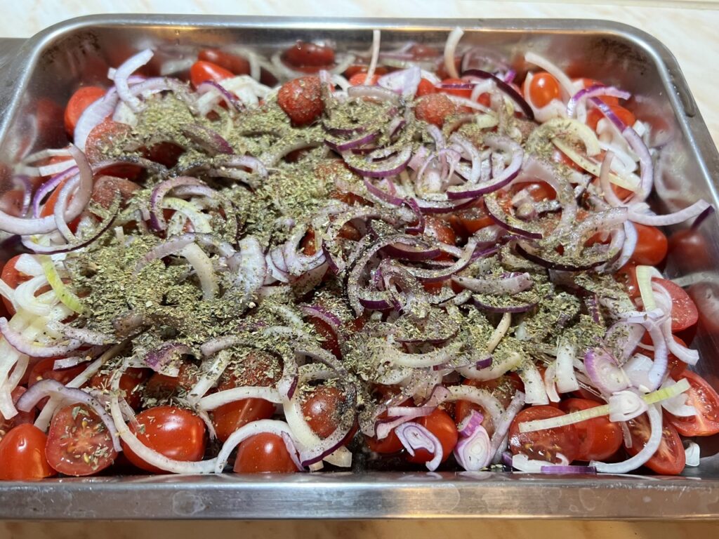 - Зехтинът и балсамовият оцет се изсипват равномерно върху нарязаните продукти в тавата.