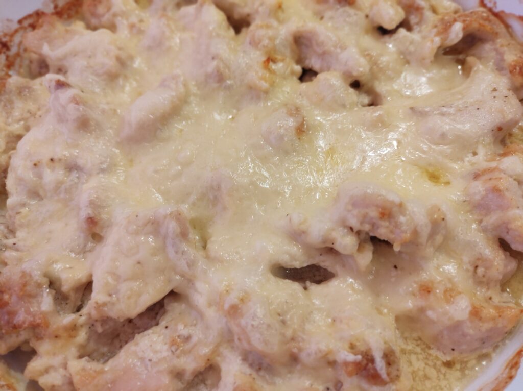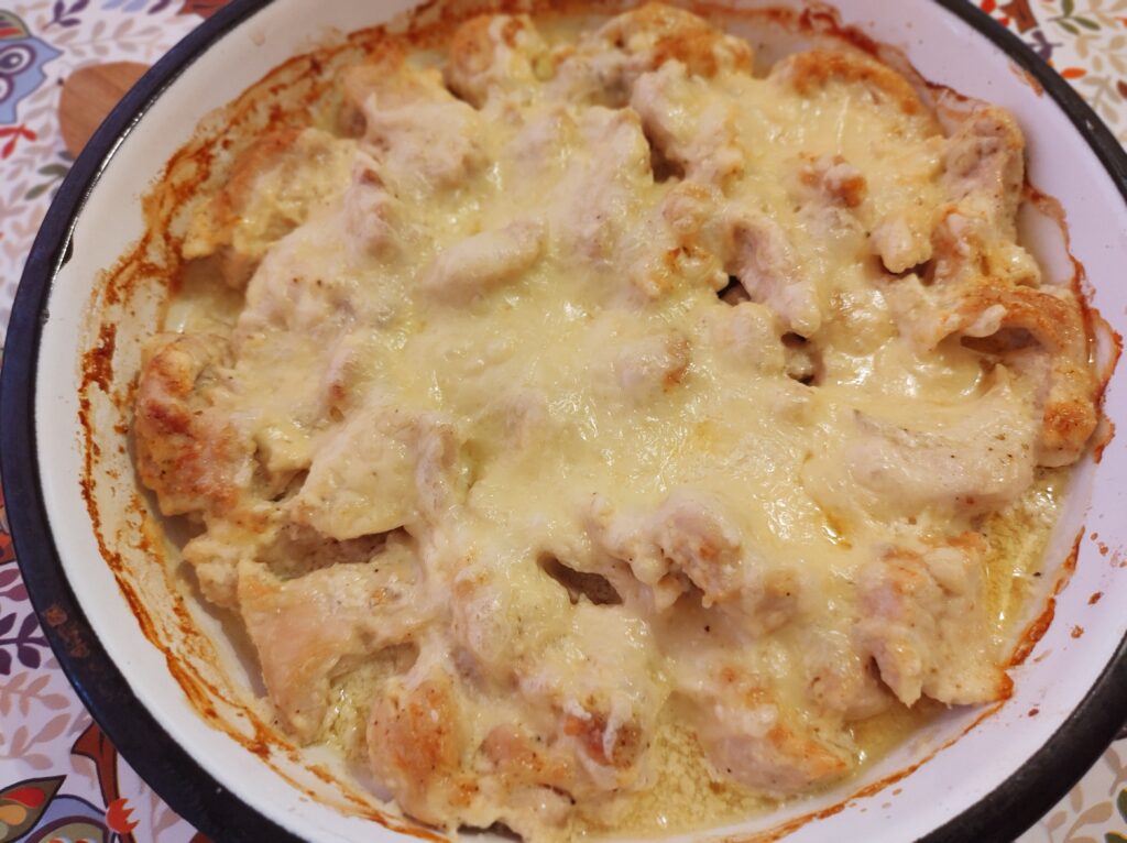 Неустоими късчета от пилешко филе, запечени с майонеза, кашкавал и къри.