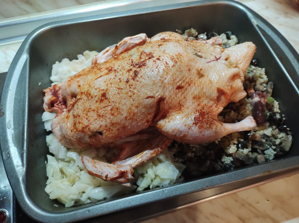 - Патицата се пълни с плънката като обикновено плънката е повече от капацитета на патицата. Това не е проблем, тъй като остатъкът се изсипва като основа в едната половина на дълбока тава, в която ще се пече патицата.