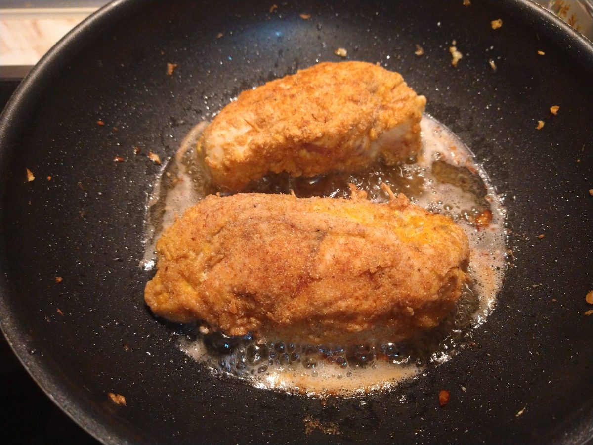 - Овалвам месото в яйце и брашно или галета (а може и двете, за по-плътна панировка) – моите са само с яйце и брашно, понеже нямах галета у дома. Пържим в нагорещено олио в дълбок тиган.