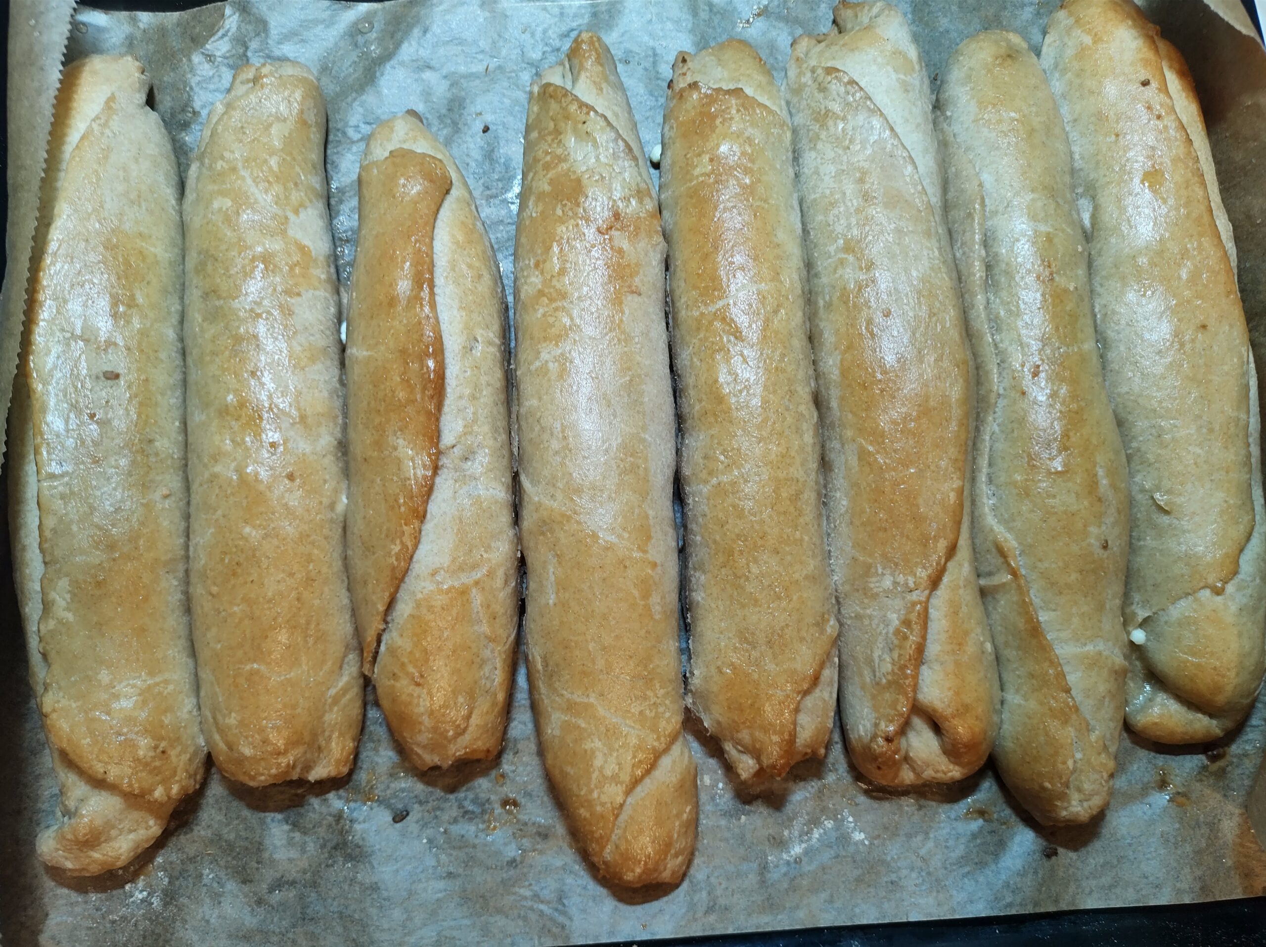 - Втасалите рогчета намазвам с разбито яйце.