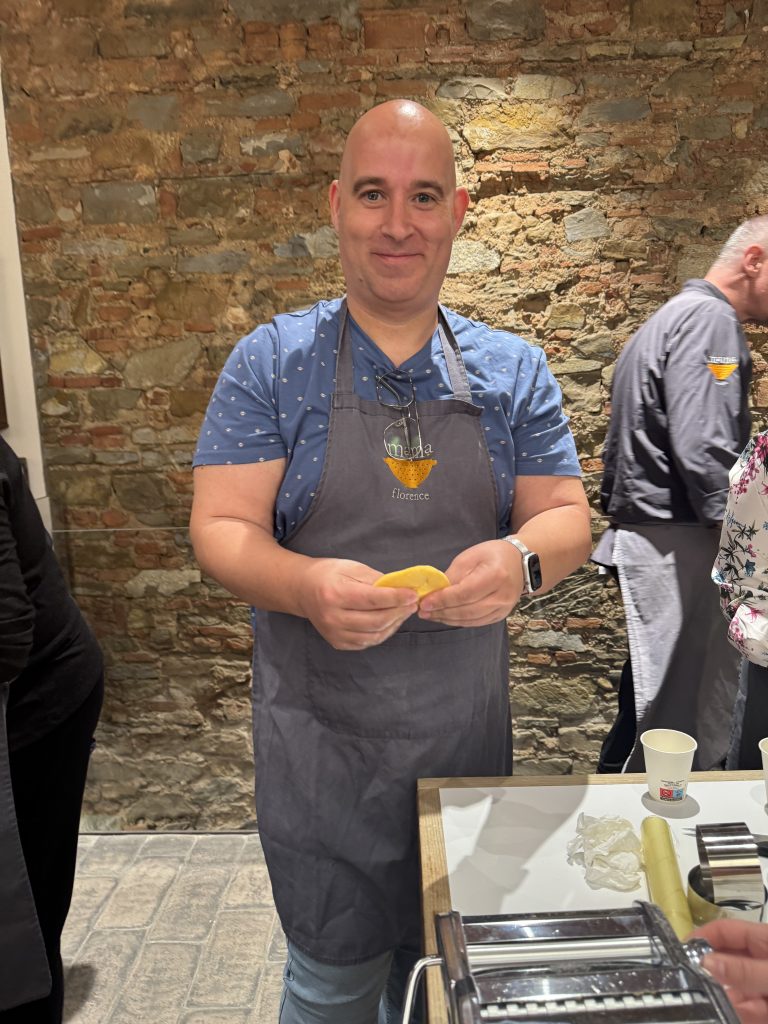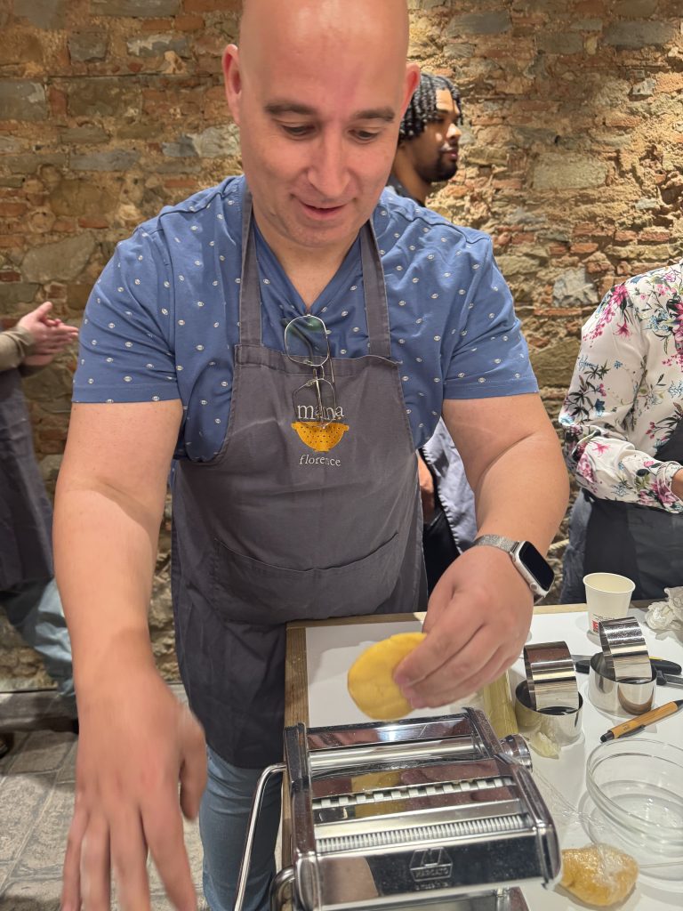 Вечерта ни очакваше нещо съвсем различно – урок по готварство в Mama Florence Cooking School. Разделени на отбори, започнахме от нулата – брашно (смес от семолина и бяло), яйца и много ентусиазъм. Замесихме тесто, оставихме го да почине, после го разточвахме на тънки листи. От едната част направихме пълнена паста – нещо като тортелони, с пълнеж от картофено пюре, масло, чесън и подправки. От другата – класически ленти за паста (тип талиатели), изрязани от изсъхналите листи. Имаше и състезателен елемент – шеф-готвачите оценяваха работата ни по качество, количество, организация и чистота. Един от тях дори е бил част от журито на MasterChef Italy. С минимална преднина нашият отбор спечели! Наградата – шефски шапки с автограф. След това дойде най-хубавата част – дегустацията. Слязохме за кратко на аперитив с просеко и антипасти, а после се върнахме горе, където ни чакаше богата маса с всичко, което бяхме приготвили – паста със сос от тиквички, паста с доматен сос и колбаси, вино и десерт. Незабравима вечер.