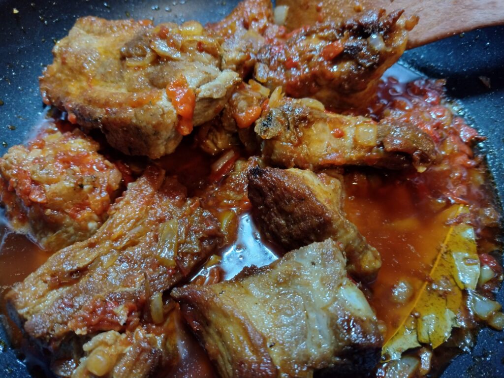 - В дълбока тенджера със сгорещено олио запечатвам ребрата, докато придобият златист загар от двете страни. Ребрата се оставят настрана.