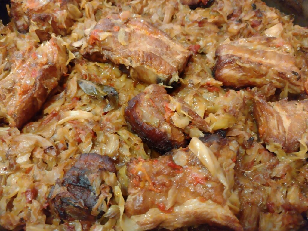 - Така приготвените ребра с подправките и запръжката се прехвърлят в тавата при зелето като всичко се разбърква добре. Аз лично предпочитам да го правя с ръце.